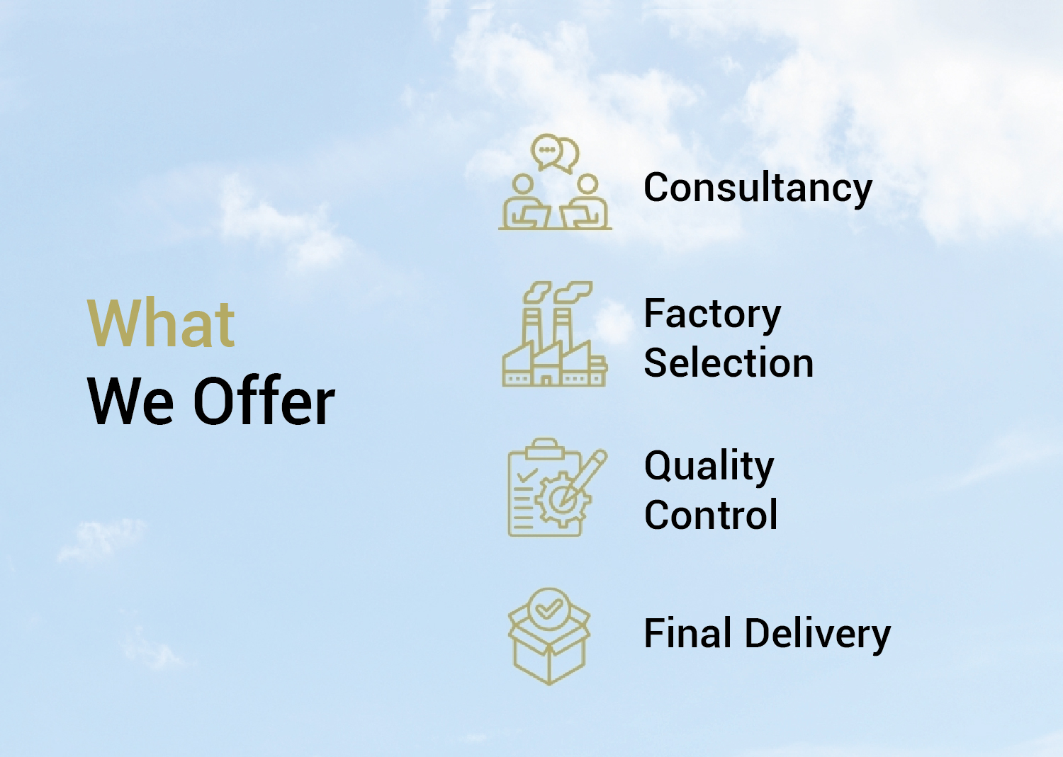 Our goal is to simplify international manufacturing. We handle everything — supplier selection, production follow-up, quality control, and logistics — with transparency and ethics at every step.